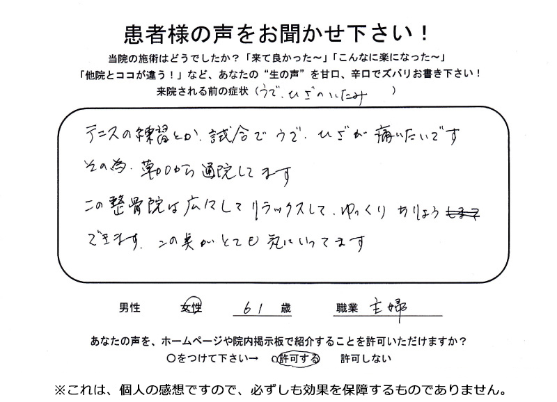 テニスの練習とか、試合でうで、ひざが痛いです。その為、草加から通院しています…