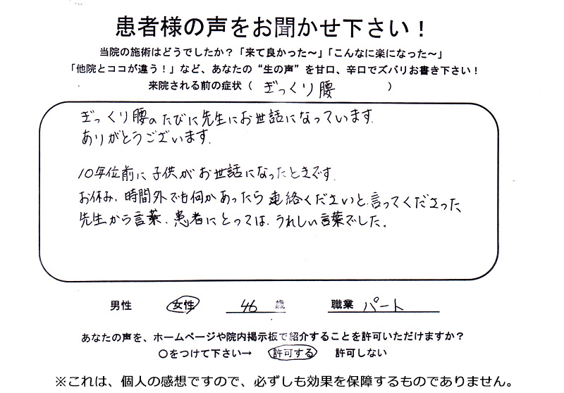 ぎっくり腰のたびに先生にお世話になっています。ありがとうございます。