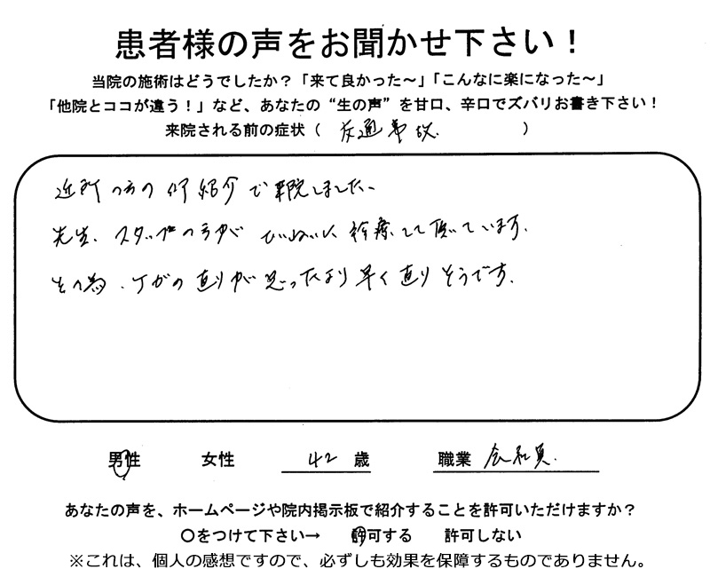 以前にも通ったことがあり、今回、職場でぎっくり腰を発祥しました。職場近くの整形外科で診てもらいましたが、その後の施術は金子整骨院と決めて通っています。