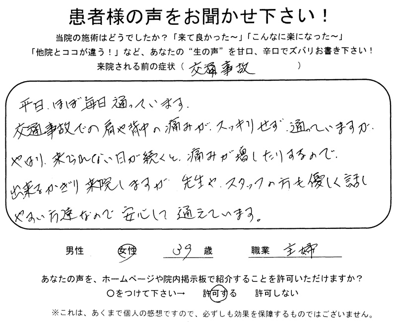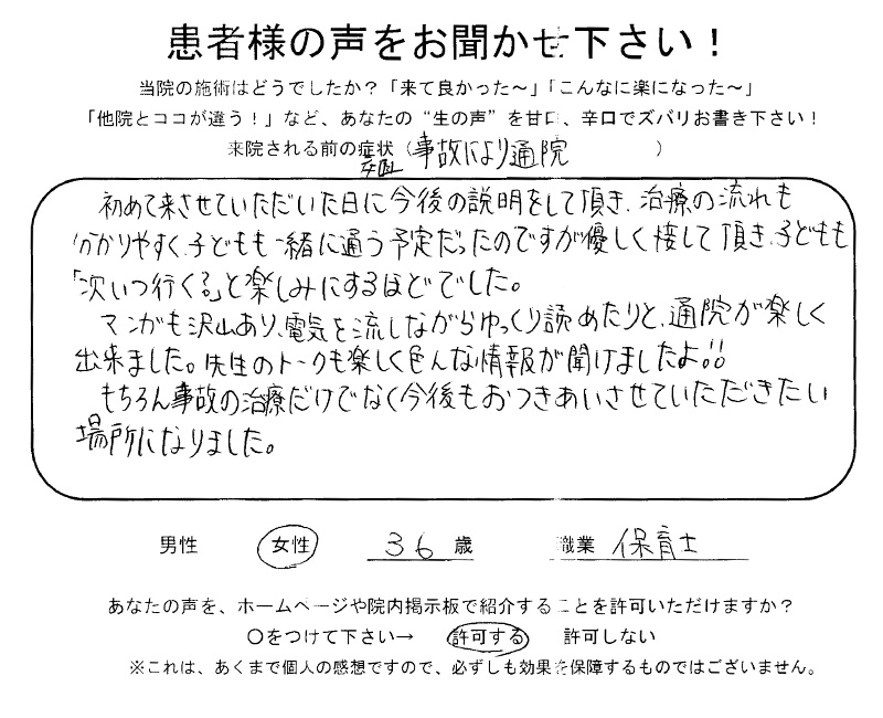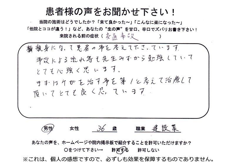 交通事故にて通院致しました。先生の説明、今後の見通しなどとても判りやすく教えて頂きとても安心して通院できる整骨院さんだと思います。